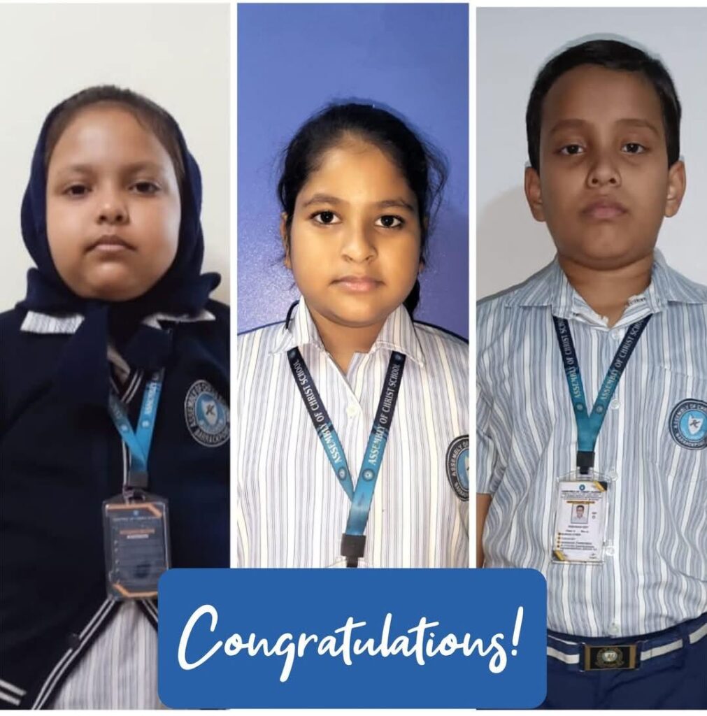 Young Achievers from ACS Excel in English Olympiad 2025 International Olympiad of English Language 2025 (LEVEL 1) Achievers: Sumedha Patra, Rishaan Dey and Sayna Khatun, students of class II of assembly of Christ School have ranked 1 in class, state and zonal levels and ranked 4 in the National level. Back